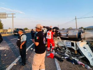 Penjamo.-Un tracto camión volcó la mañana de este miércoles sobre la carretera Pénjamo-La Piedad y…
