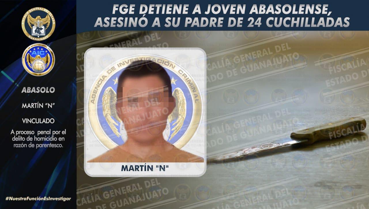 Abasolo, Gto. 25 de enero de 2022.- Un hombre de 49 años de edad fue asesinado de veinticuatro cuchilladas en el cuerpo mientras se encontraba en su domicilio, la navidad de 2021, en Abasolo. Por desavenencias familiares, su hijo de 24 años, le arrebató la vida. Ha sido detenido por agentes de investigación criminal y vinculado a proceso penal, enfrenta cargos por homicidio en razón de parentesco.