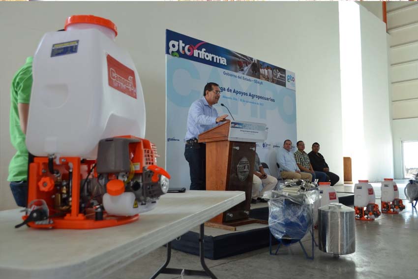 En este evento 200 productores recibieron igual número de mochilas aspersoras, las cuales son motorizadas a 4 tiempos, promoviendo la producción, competitividad y sustentabilidad de la actividad agrícola, innovando el trabajo en el campo y reduciendo el tiempo de aplicación de químicos y foliares.