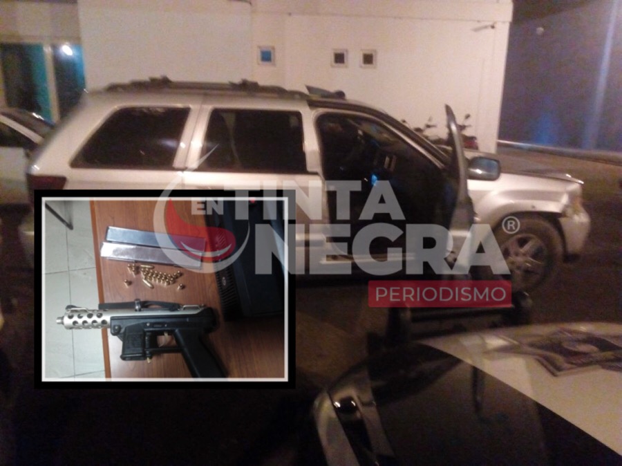 Los sujetos se perdieorn entre la colonia Loma Bonita y colonia Miguel Hidalgo. Las autoridades aseguraron una camioneta gran cherokee de color gris con tablillas americanas y en su interior una ametralladora calibre 9mm con la leyenda intracte miami 9mm luger modo,tec -9 patents pendig con número de serie 42021 ,con dos cargadores y 23 cartuchos útiles las cuales se dejaron a disposición del ministerio público para deslindar responsabilidades.