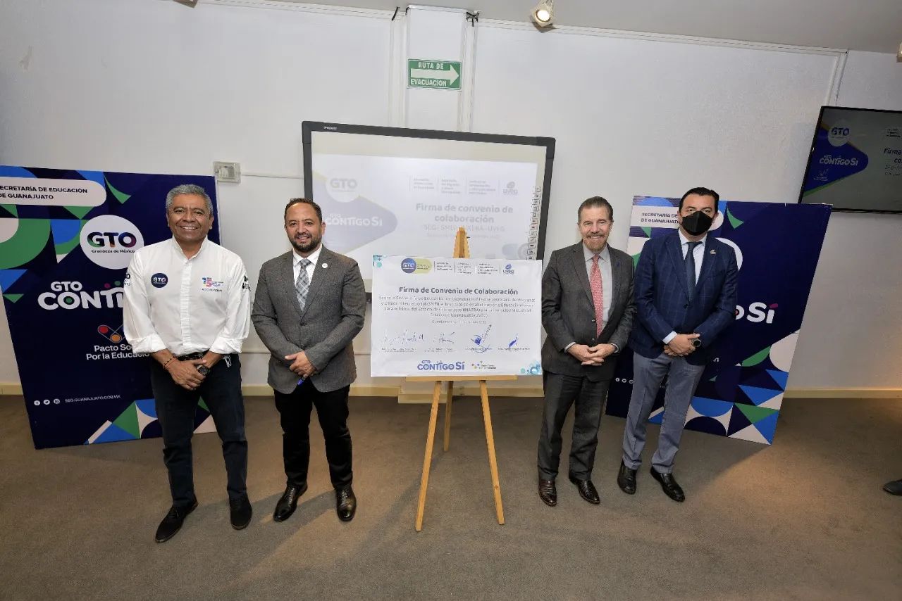 El convenio de colaboración fue signado por el Secretario de Educación del Estado de Guanajuato, Mtro. Jorge Enrique Hernández Meza; el Secretario del Migrante y Enlace Internacional, John Robert Hernández; José Ricardo Narváez Martínez, Rector de UVEG; y José Jesús Correa Ramírez, Director General de INAEBA.