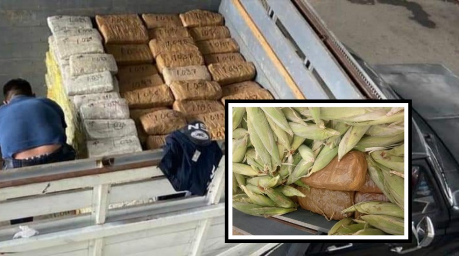 Al realizar la revisión de la carga, localizaron los elotes a granel que ocultaban 867 paquetes que tenían un vegetal seco con las características de la mariguana con un peso aproximado de 945 kilos 568 gramos.