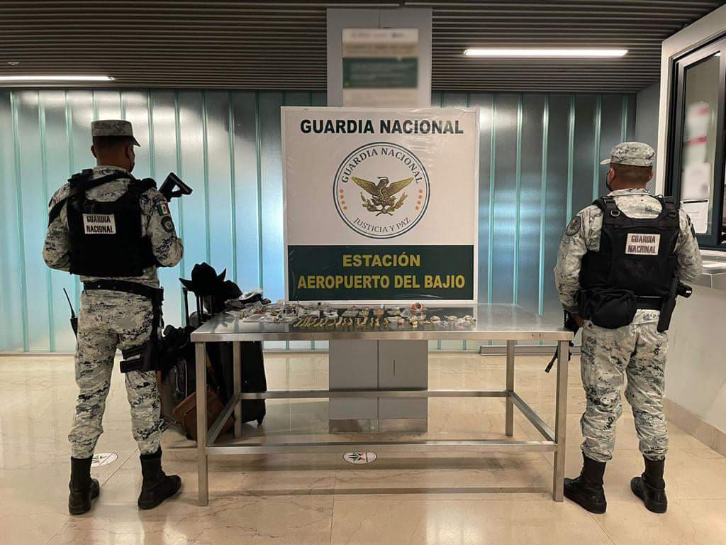 GUANAJUATO, Gto; 11 de marzo del 2022.- Un aproximado de 80 piezas de joyería con valor cercano a 43 millones de pesos, fueron decomisadas en el Aeropuerto Internacional del Bajío, en el estado de Guanajuato, por elementos de la Guardia Nacional (GN) y personal de la Agencia Nacional de Aduanas de México (ANAM).
