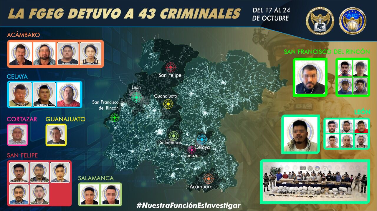Guanajuato, Gto. 26 de octubre de 2021.- La detención legal de 43 inculpados  que han sido procesados penalmente en el lapso del 17 al 24 de octubre, bajo cargos de homicidio, homicidio en grado de tentativa, secuestro, homicidio en grado de tentativa en agravio de servidores públicos, desaparición cometida por particulares en grado de tentativa, lesiones y robo calificado, fortalecen la procuración de justicia y ponen de relieve las acciones de la Fiscalía General del Estado en la investigación del delito y sus responsables.