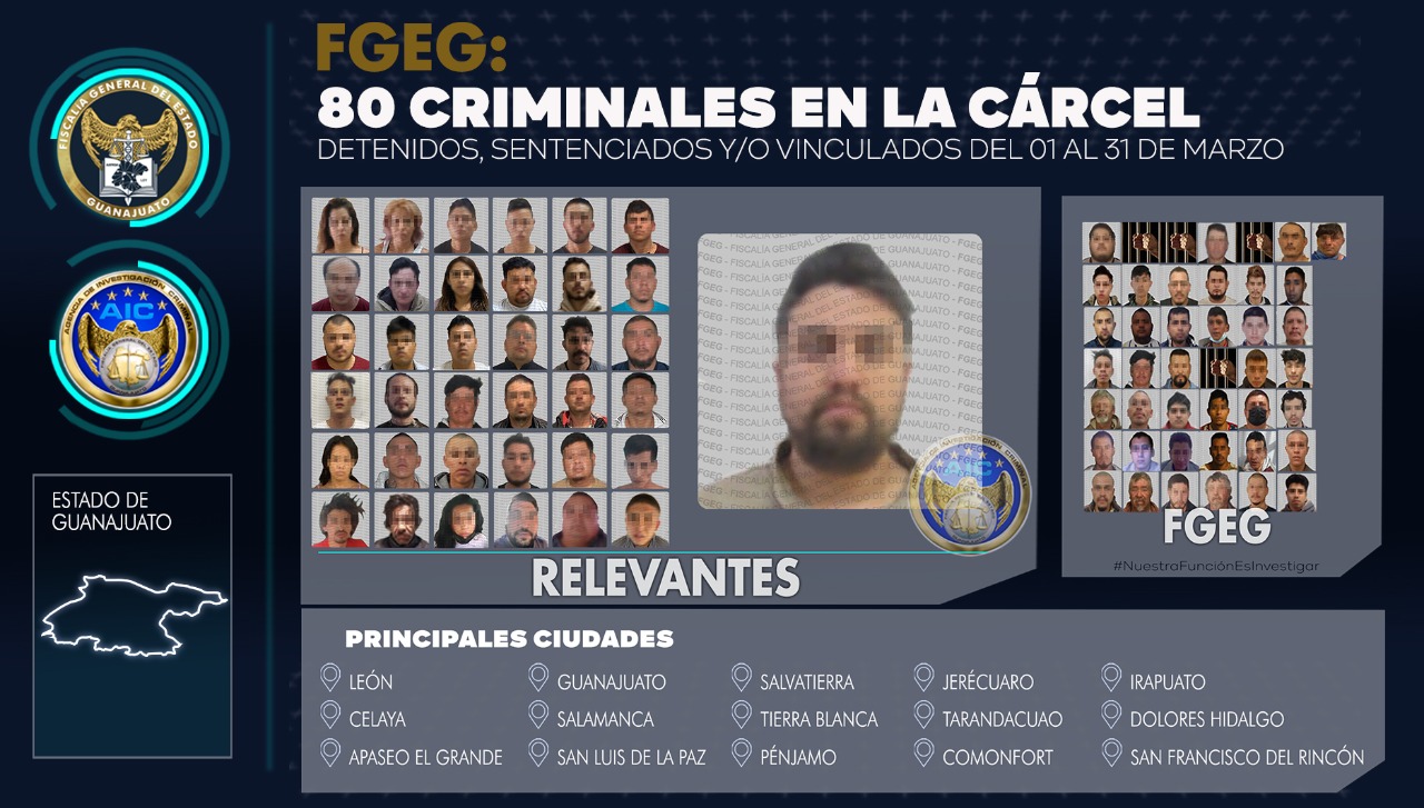 Guanajuato, Gto. 1° de abril de 2022.- Al cierre del mes de marzo, la Fiscalía General del Estado intervino en la detención de 80 infractores relevantes, quienes fueron presentados ante el Juez como presuntos responsables de varios delitos del fuero común. Entre los detenidos figuran casos que impactaron a la sociedad y que derivaron en la detención de los responsables, como es el caso de JULIO CÉSAR “N” alias “La Gringa”, quien intervino en la desaparición de la Maestra Lupita, en Salvatierra. El secuestro de un adolescente y un adulto, en Irapuato, cuyo responsable es JOSÉ IGNACIO “N”, que ha sido sentenciado a 70 años de cárcel.