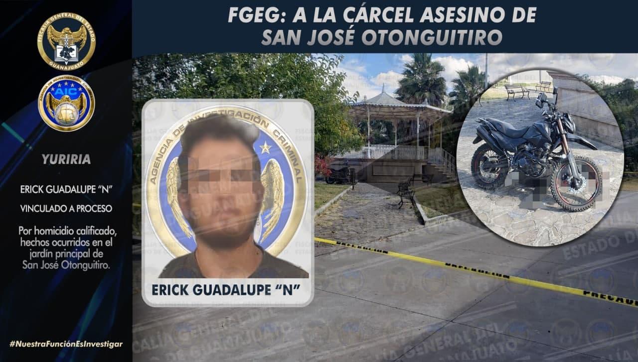Yuriria, Gto. 10 de febrero de 2022.- Un joven de 22 años fue muerto con disparos de arma de fuego que perforaron su cráneo, tórax y abdomen, en hechos ocurridos el 25 de enero de este año. El responsable, *ERICK GUADALUPE “N”*, y otro sujeto llegaron hasta el jardín principal de la comunidad San José Otonguitiro, ubicada a 31.3 kilómetros de Yuriria, en dirección Noroeste, y asesinaron a Jonathan David “N”, quien fue localizado encapuchado y en una motocicleta con reporte de robo.