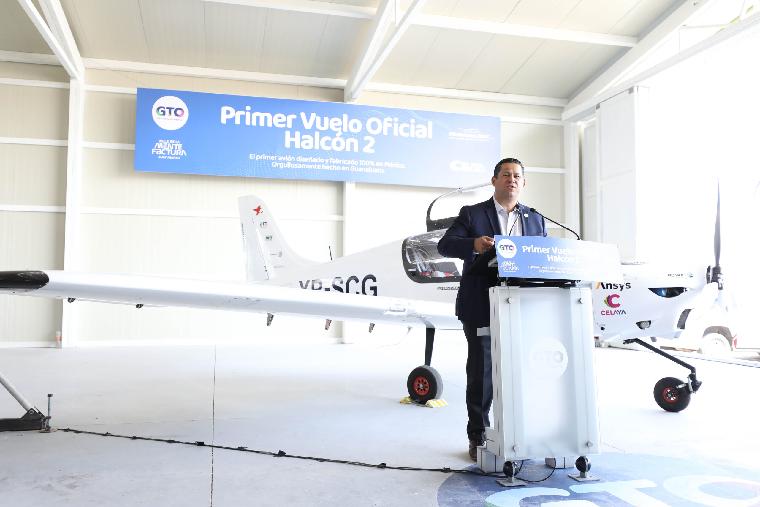 Celaya, Gto. 04 de julio de 2022.- El Gobernador del Estado, Diego Sinhue Rodríguez Vallejo, encabezó la ceremonia del primer vuelo oficial del avión Halcón II, aeronave 100 por ciento mexicana realizada en territorio guanajuatense por la empresa Horizontec.
