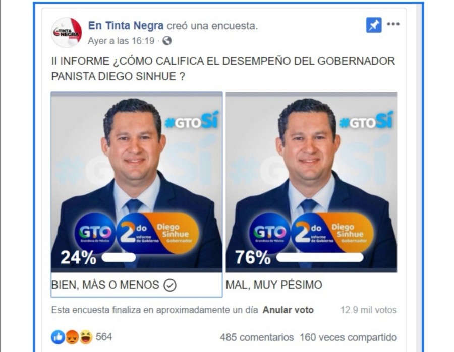 *7 DE MARZO, 22:30 HORAS:* Se ratifica que la estructura panista esta disfrutando sus días de asueto y no responde a las desesperadas peticiones de entrar a Facebook para votar a favor del Gobernador en la encuesta de *EN TINTA NEGRA*. Van 17,700 votos, pero los porcentajes de votos a favor y en contra se mantienen. Se da luz verde a la *operación con bots* para revertir la tendencia y hacer que Diego Sinhue gane la encuesta. *Lo único que obstaculizaría la instrumentación del plan, es que el mismo quede al descubierto.*