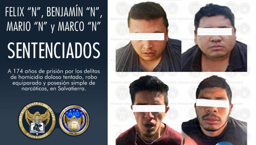 Salvatierra, Gto. 10 de marzo de 2020.- La Fiscalía General del Estado obtuvo una sentencia condenatoria de 174 años de prisión en contra de cuatro culpables del delito de homicidio doloso tentado, en agravio de elementos de la Agencia de Investigación Criminal, hechos ocurridos en la comunidad El Capulín, en Salvatierra, cuando los servidores públicos acudieron a efectuar un operativo para recuperar un vehículo robado.