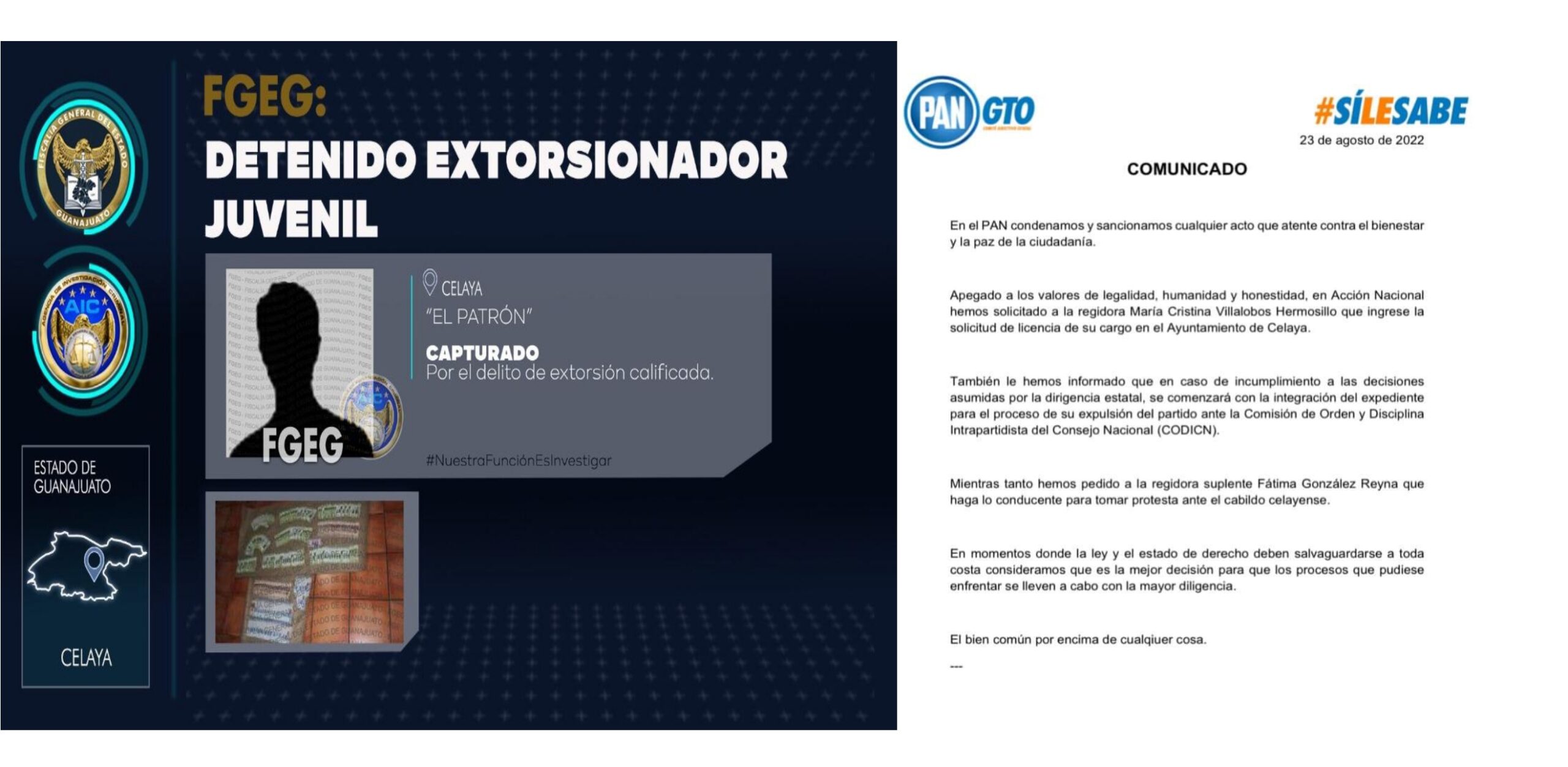 Celaya, Gto; 24 de agosto del 2022 – Ante la detención de un adolescente que extorsionaba a comerciantes en Celaya y trascendió es hijo de la regidora panista María Cristina Villalobos Hermosillo, el Comité Directivo Estatal del PAN ha solicitado a la edil que pida licencia al cargo y de no hacerlo,  conforme a los estatutos se iniciará el procedimiento de expulsión.