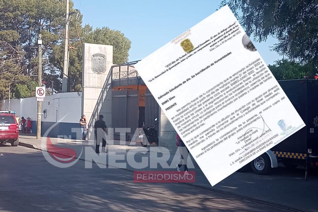 Y aunque en ningún momento estuvo en riesgo la población estudiantil, la directora de la ENMS Silao, María Cristina Caudillo Hernández envío una circular dirigida a los alumnas del 6to semestre del bachillerato de Humanidades informando la decisión de suspender las actividades escolares.