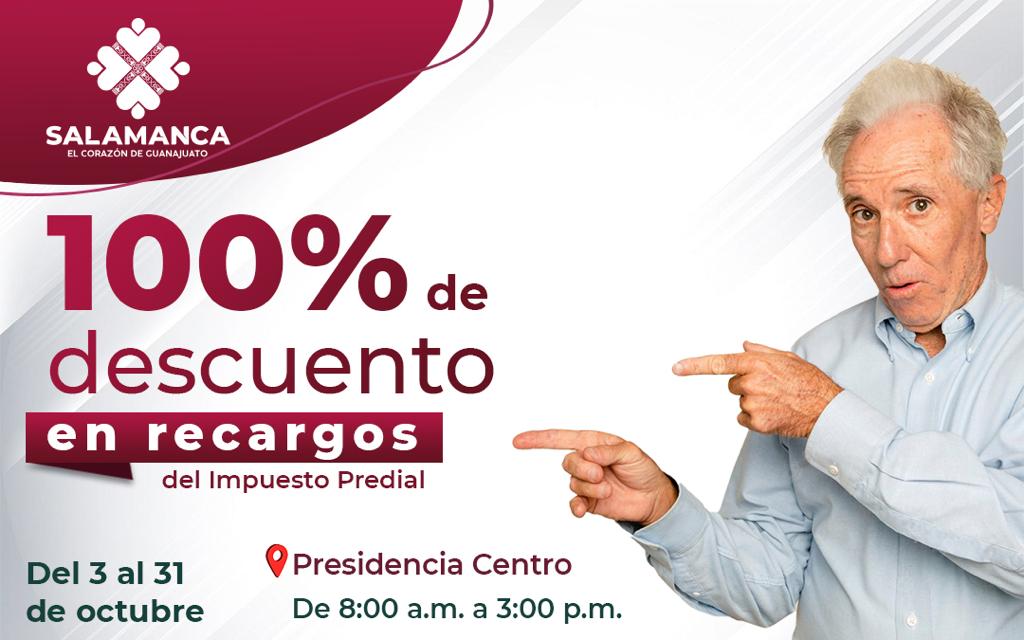 Salamanca, Gto; 03 de octubre del 2022.- A fin de contribuir en la economía de los salmantinos, el Gobierno Municipal, a través del área de Tesorería y la Dirección de Catastro e Impuesto Predial, estará aplicando el 100% de descuento en recargos del impuesto predial 2022, a partir del 03 al 31 de octubre del presente año.