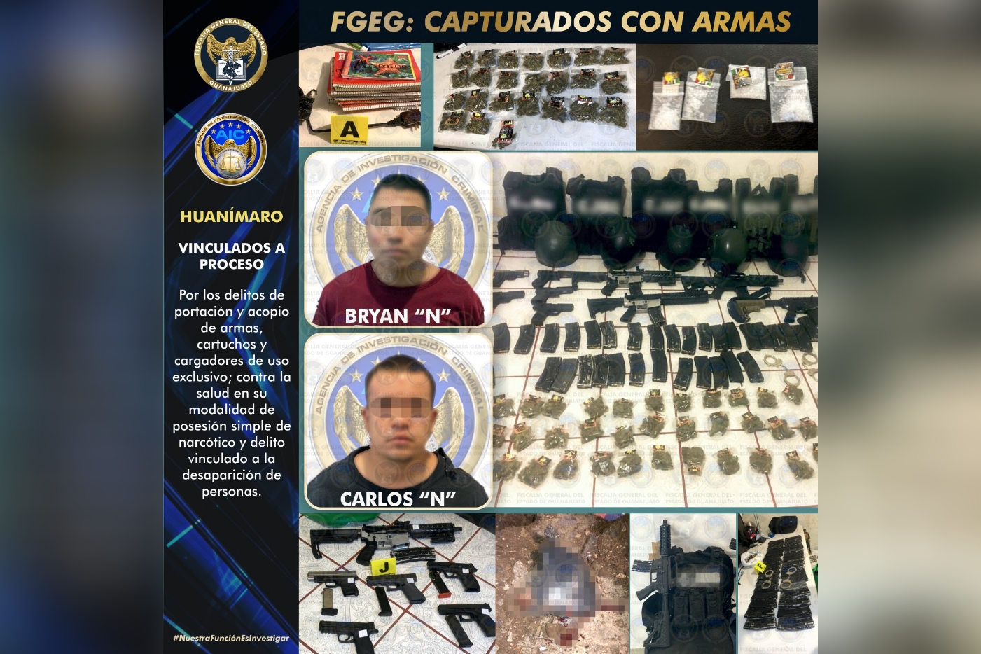 Guanajuato, Gto., 16 de octubre de 2021.- Al judicializar el aseguramiento y detención de sicarios detenidos en la colonia Magisterial en Huanímaro, la FGEG obtuvo la vinculación a proceso por delitos contra la ley Federal de Armas y Explosivos; contra la salud; desaparición forzada por particulares y homicidio.