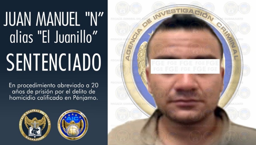 Pénjamo, Gto. 06 de febrero de 2021.- En procedimiento abreviado la Fiscalía General del Estado (FGE) obtuvo sentencia condenatoria de 20 años en prisión para Juan Manuel “N” alias “El Juanillo”, culpable del homicidio de un hombre al que privó de la vida con arma de fuego; además se le impuso una multa y el pago por concepto de la reparación del pago en favor de los deudos de la víctima.