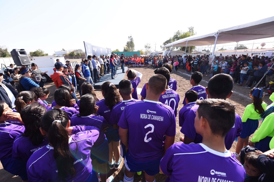 IRAPUATO, GTO., MARZO 3 DE 2018.-En el marco de la Copa Comunidades celebrada en el poblado La Caja, el Presidente Municipal Ricardo Ortiz Gutiérrez, aparte de apadrinar a 10 parejas que contrajeron matrimonio por lo civil y a 7 menores que fueron registrados, anunció que el próximo mes FERROMEX iniciará la construcción del puente peatonal que comunicará a la Colonia Primero de Mayo.