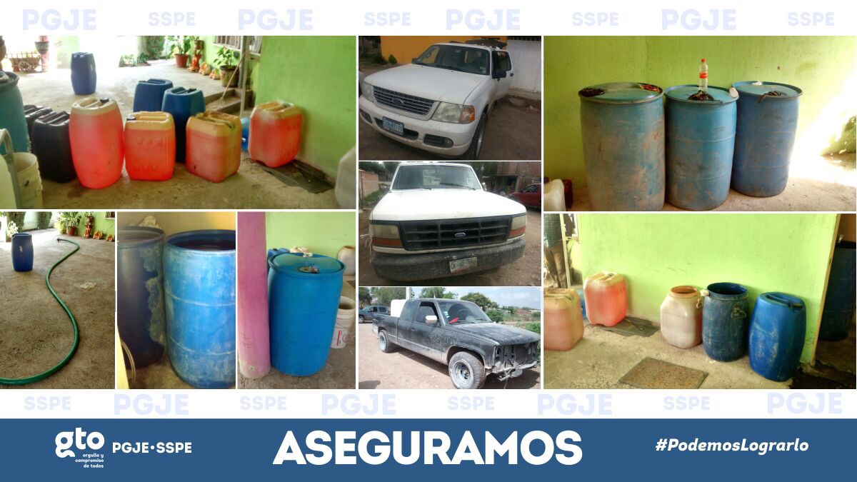 Irapuato, Gto. 28 de junio de 2017.- La Procuraduría General de Justicia del Estado (PGJE) y la Secretaría de Seguridad Pública del Estado (SSPE) llevaron a cabo un cateo en el municipio de Irapuato, donde se incautaron cientos de litros de hidrocarburo ilícito, así como la recuperación de vehículos robados que utilizaban para el trasiego.