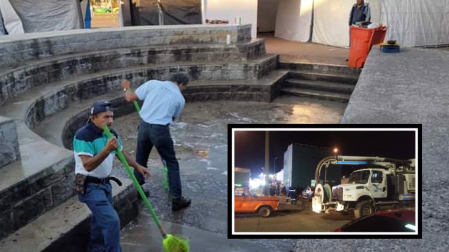 Alberto Medina Mendiola, jefe del Departamento de Aseo y Limpia, indicó que el área de Mercados y Aseo Público trabajaron desde temprano para hacer un barrido y lavado del foro en el que se registró el percance.