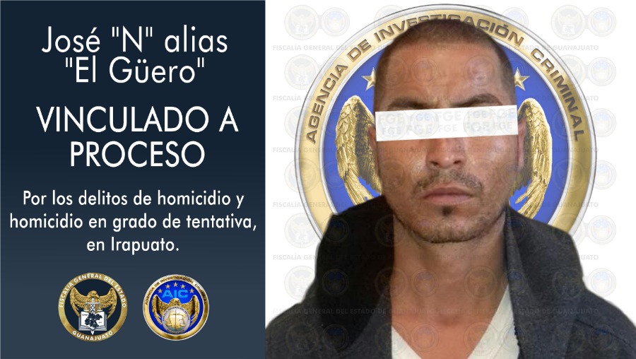 Irapuato, Gto. 31 de diciembre de 2020.- Agente de la Fiscalía General del Estado (FGE) formuló imputación a José “N” alias “El Güero” ante un Juez, y obtuvo su vinculación a proceso penal, por el delito de homicidio cometido en agravio de un hombre y homicidio en grado de tentativa en agravio de una mujer, quienes fueron agredidos con arma de fuego mientras se encontraban en un autolavado, el pasado 07 de septiembre.