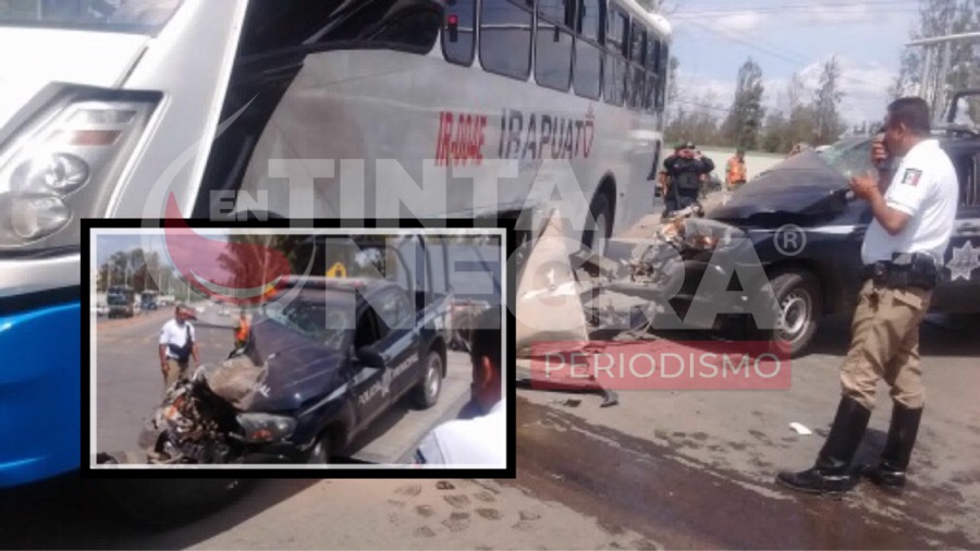 Irapuato.- Policías municipales dejaron fuera de circulación una patrulla luego de impactarse contra un camión de pasajeros de la ruta 51.