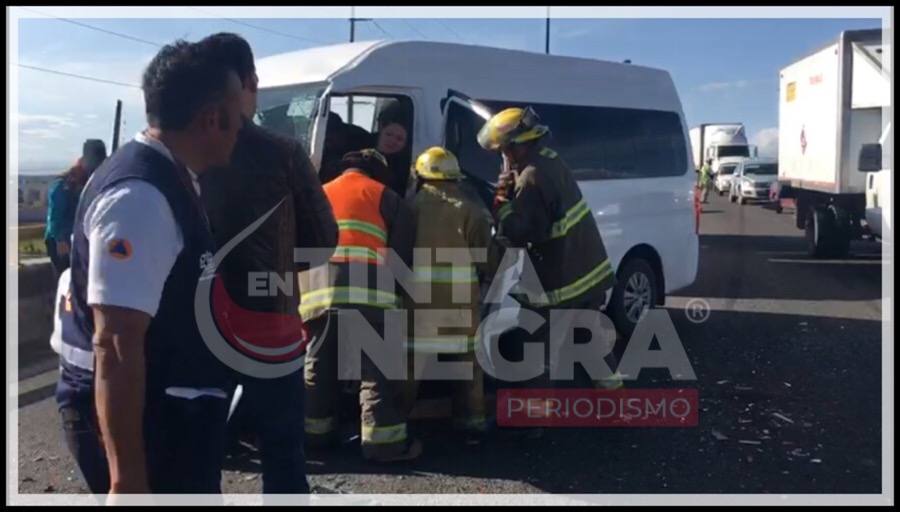 Una mujer que viajaba en el asiento delantero de la camioneta tipo Van quedó prensada con el tablero y rescatada por Paramédicos de Cruz Roja y elementos de Bomberos.