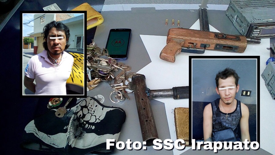 Irapuato.-Agentes de Policía Municipal grupo Lobo, detuvieron a dos sujetos tras el atraco a varios estudiantes. Los inculpados tenían en su poder dos armas y varios objetos al parecer producto de distintos robos informó la Secretaría de Seguridad Ciudadana.
