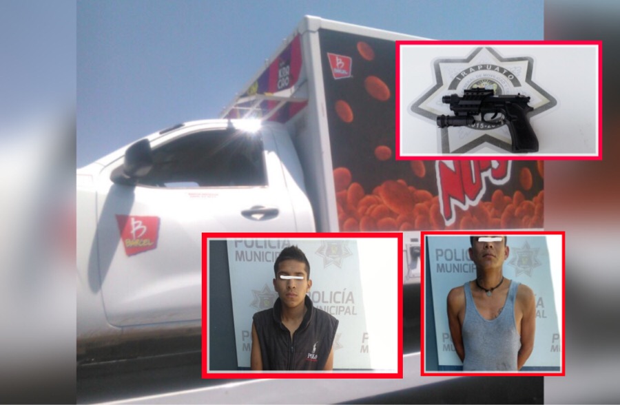 Irapuato.-Armados con una pistola de plástico dos sujetos asaltaron al repartidor de frituras de conocida marca. En una reacción oportuna de agentes policiales detuvieron a los inculpados.