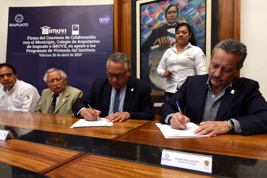 Irapuato, Gto. 26 de abril de 2019.- Con la finalidad de regularizar un promedio de 5 mil lotes en el municipio durante este trienio, autoridades del Gobierno Municipal, del Colegio de Arquitectos de Irapuato y el Instituto Municipal de Vivienda de Irapuato (IMUVII), firmaron un convenio de colaboración.