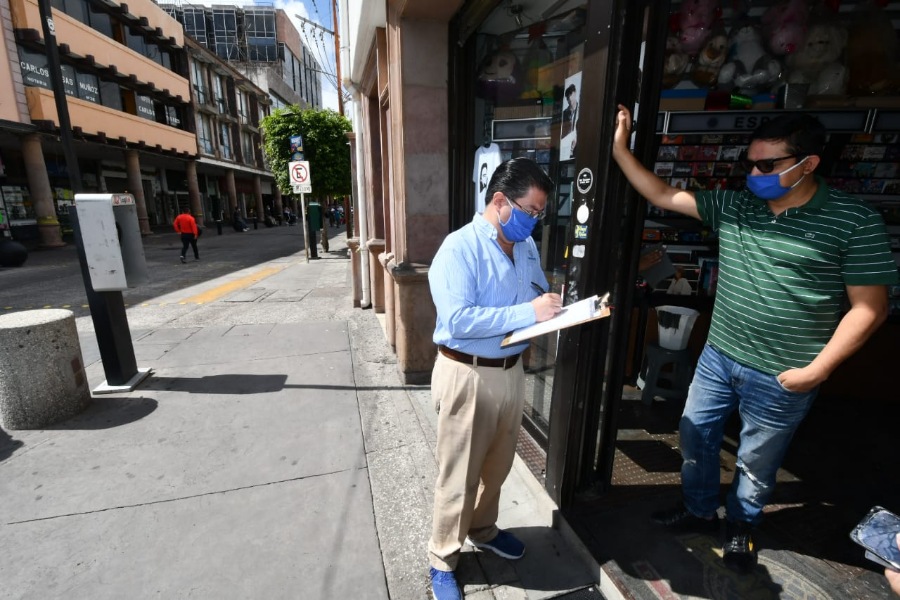 Irapuato, Gto. 25 de junio del 2020.- Un recorrido por establecimientos y comercios de las calles Ramón Barreto de Tábora y Juárez, realizó personal de la Administración Municipal, para dar a conocer los detalles de las obras de rehabilitación en estas vialidades.