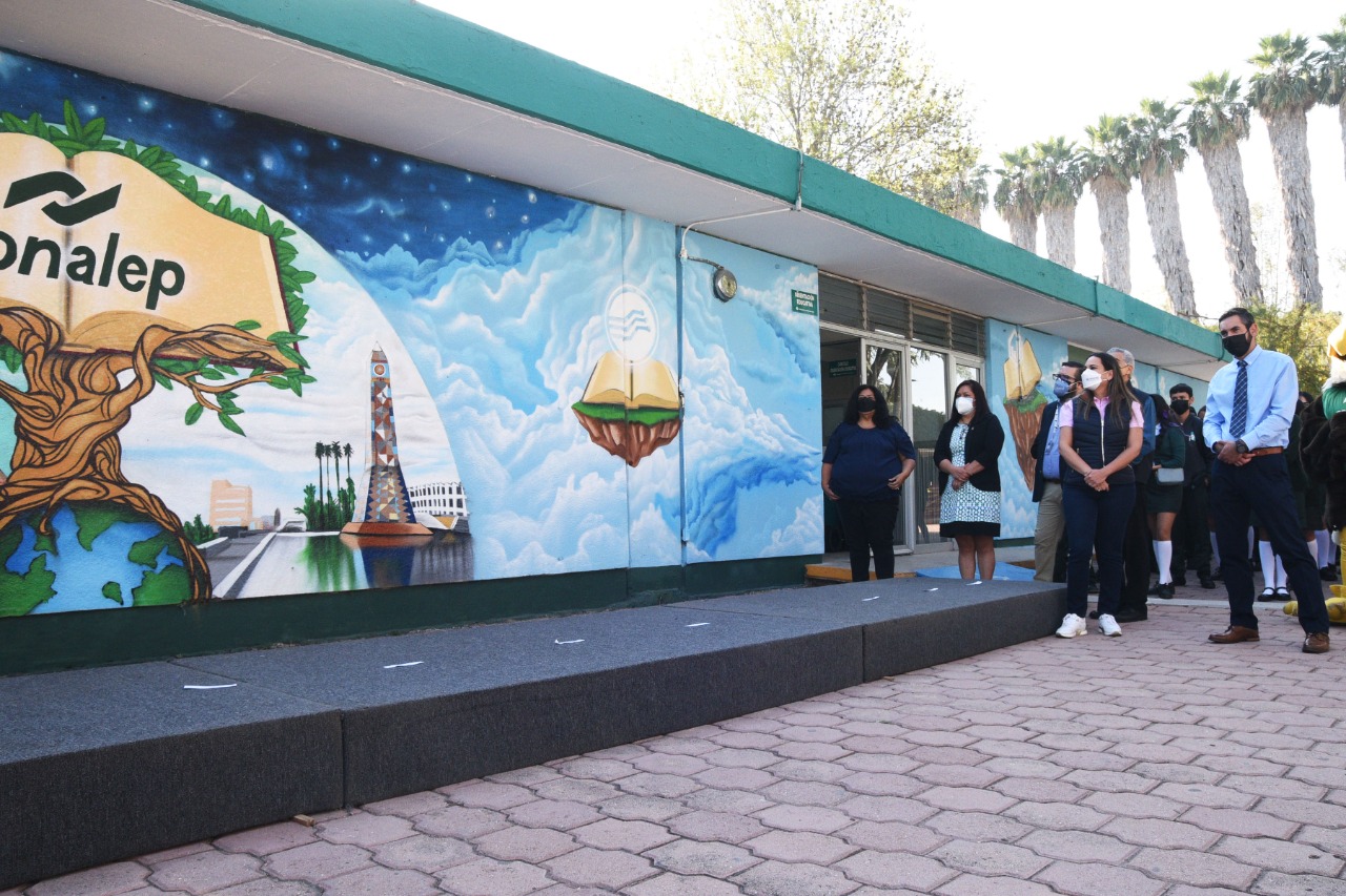 Las y los alumnos del Conalep, junto a las autoridades, inauguraron el mural realizado en sus instalaciones, que resalta los sentidos de identidad, pertenencia y orgullo por la ciudad.