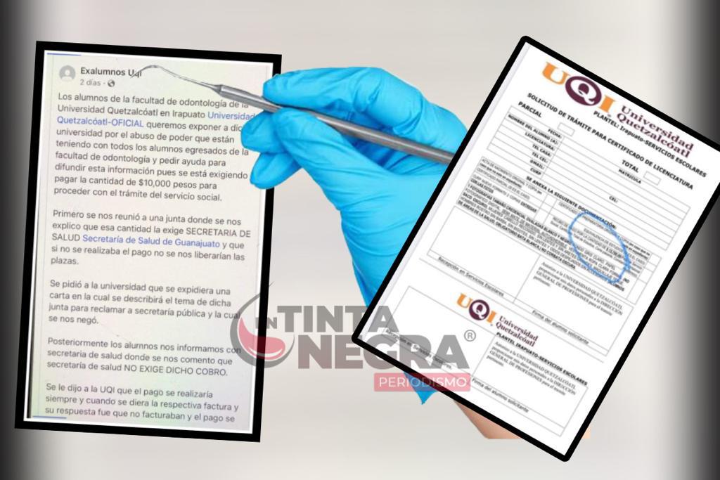 Irapuato, Gto; 20 de diciembre del 2022.- Alumnos egresados de la facultad de Odontología de la Universidad Quetzalcóatl en Irapuato, denuncian el abuso de poder y venta de plazas para realizar el servicio social en instituciones públicas de salud, por un pagó de 10 mil pesos y sin factura.