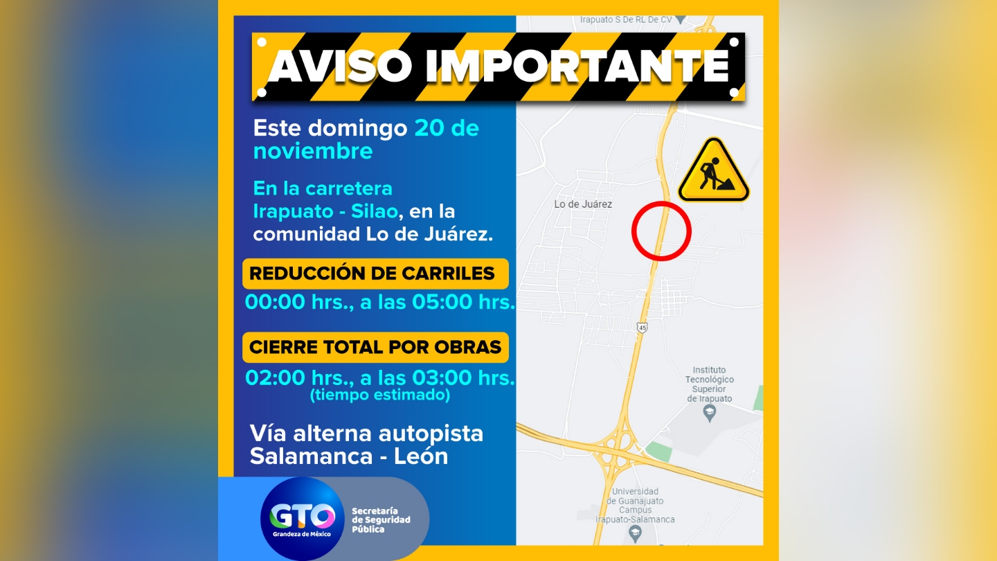 Guanajuato, Gto., 18 de noviembre de 2022.- La Secretaría de Seguridad Pública del Estado a través de la Coordinación Estatal de Protección Civil, se informa que a partir de las 00:00 y hasta las 05:00 horas de este domingo 20 de noviembre, habrá cierre total y en su momento parcial por obras en la carretera federal 45 tramo Irapuato-Silao.