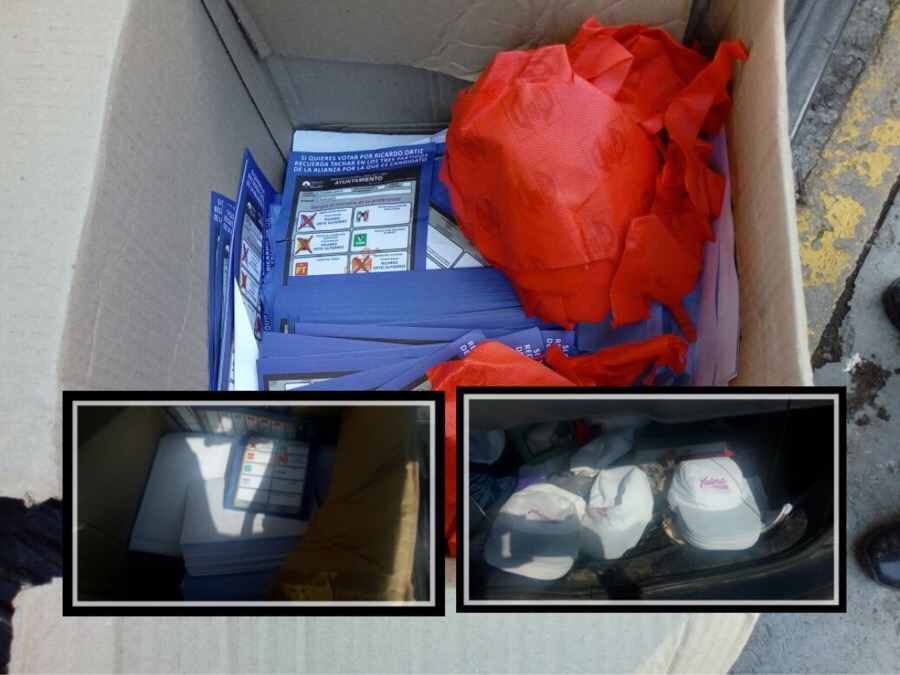 Al hacerles una revisión preventiva, tanto a las personas como a la unidad, se descubrió en la cajuela del automóvil, más folletos, así como gorras blancas con logotipo referente al proceso electoral que se encuentra en curso en este momento.