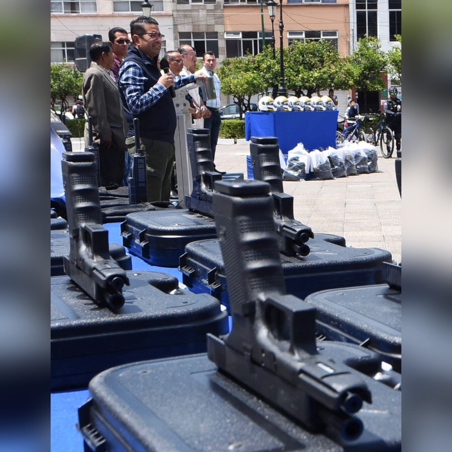 El equipo entregado éste día a elementos de la Policía Municipal fue: 29 armas cortas calibre 9 milímetros tipo Glock, 19 armas largas rifles de asalto Galil calibre 5.56, 39 mil 646 cartuchos, mil 510 uniformes tácticos que contienen camisola, pantalón, botas, gorras, fornituras, chamarra e impermeable, 52 chalecos antibala, 40 PR-24, 60 juegos de esposas, 15 cascos para moto-patrullero, 15 moto-patrullas equipadas y 100 radios portátiles tipo tetra.