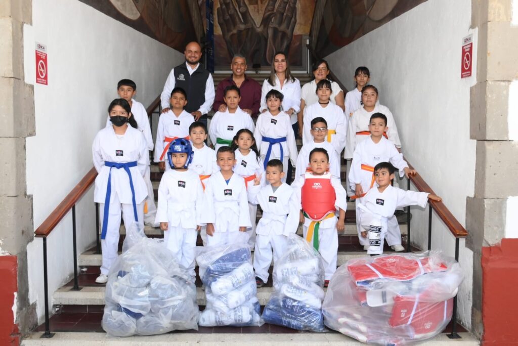 Irapuato, Gto. 17 de mayo del 2023.- El equipo de futbol varonil ‘Tigrillos’ de Guadalupe de Paso, el femenil de Carrizalito y los taekwondoines de Ex Hacienda de Márquez, recibieron durante la edición 33 del Miércoles Ciudadano, por parte de la presidenta Lorena Alfaro, equipos deportivos, uniformes y calzado.