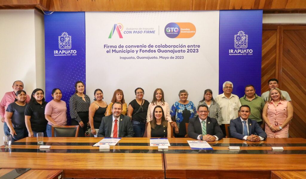 Irapuato, Gto. 30 de mayo del 2023.- Para ofrecer una mejor atención y apoyar a las micro, pequeñas y medianas empresas de Irapuato para impulsar el crecimiento de sus negocios o a quienes quieran emprender uno, autoridades del Gobierno de Irapuato firmaron el convenio de colaboración 2023 con Fondos Guanajuato.
