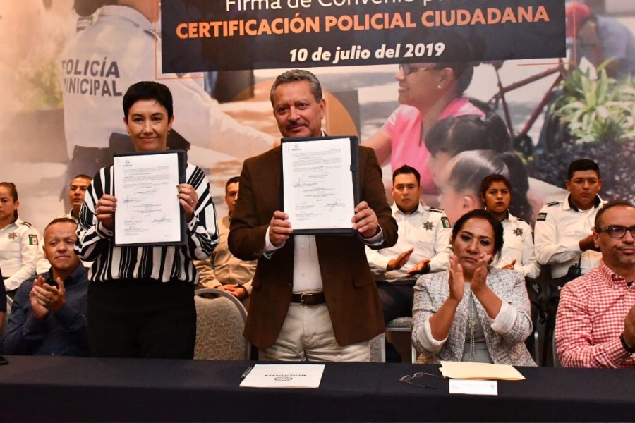 Irapuato, Gto10 de julio del 2019.- Para mejorar los procesos y tener una policía más cercana al ciudadano, autoridades municipales firmaron un convenio para la certificación policial con el Instituto para la Seguridad y la Democracia (lnsyde).