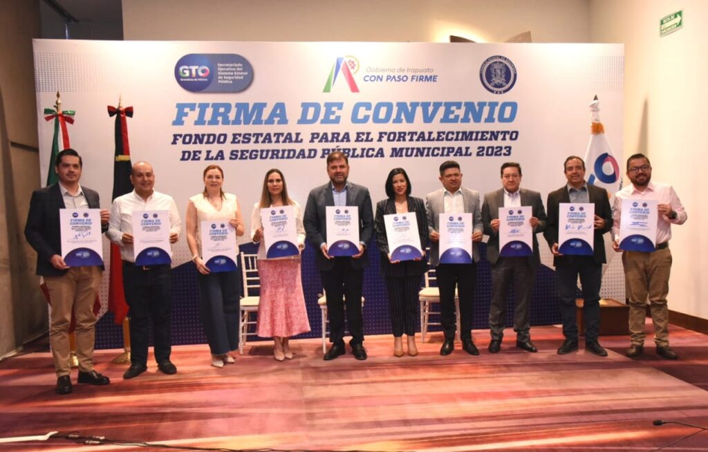 Irapuato, Gto. 26 de abril del 2023.- Autoridades de nuevo municipios, incluido el Gobierno de Irapuato, firmaron junto a autoridades del Gobierno del Estado, el convenio del ‘Fondo Estatal para el Fortalecimiento de la Seguridad Pública Municipal’, con el cual refrendan su compromiso para mantener corporaciones fortalecidas al servicio de la ciudadanía.
