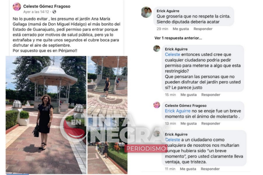 Pénjamo. – Haciendo gala de su investidura como diputada local plurinominal, Celeste Gómez Fragoso sin cubrebocas se cruzó la cinta amarilla para entrar al jardín principal el cual ya «extrañaba».