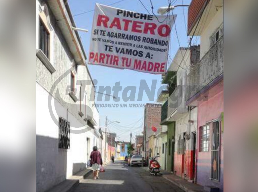 «Pinche Ratero si te agarramos robando no te vamos a remitir a las autoridades te vamos a partir la madre» es el mensaje que se lee en dos mantas que fueron colocadas sobre la calle Ciruelo esquina con Guanajuato y otra en la esquina con la Calle Higuera.