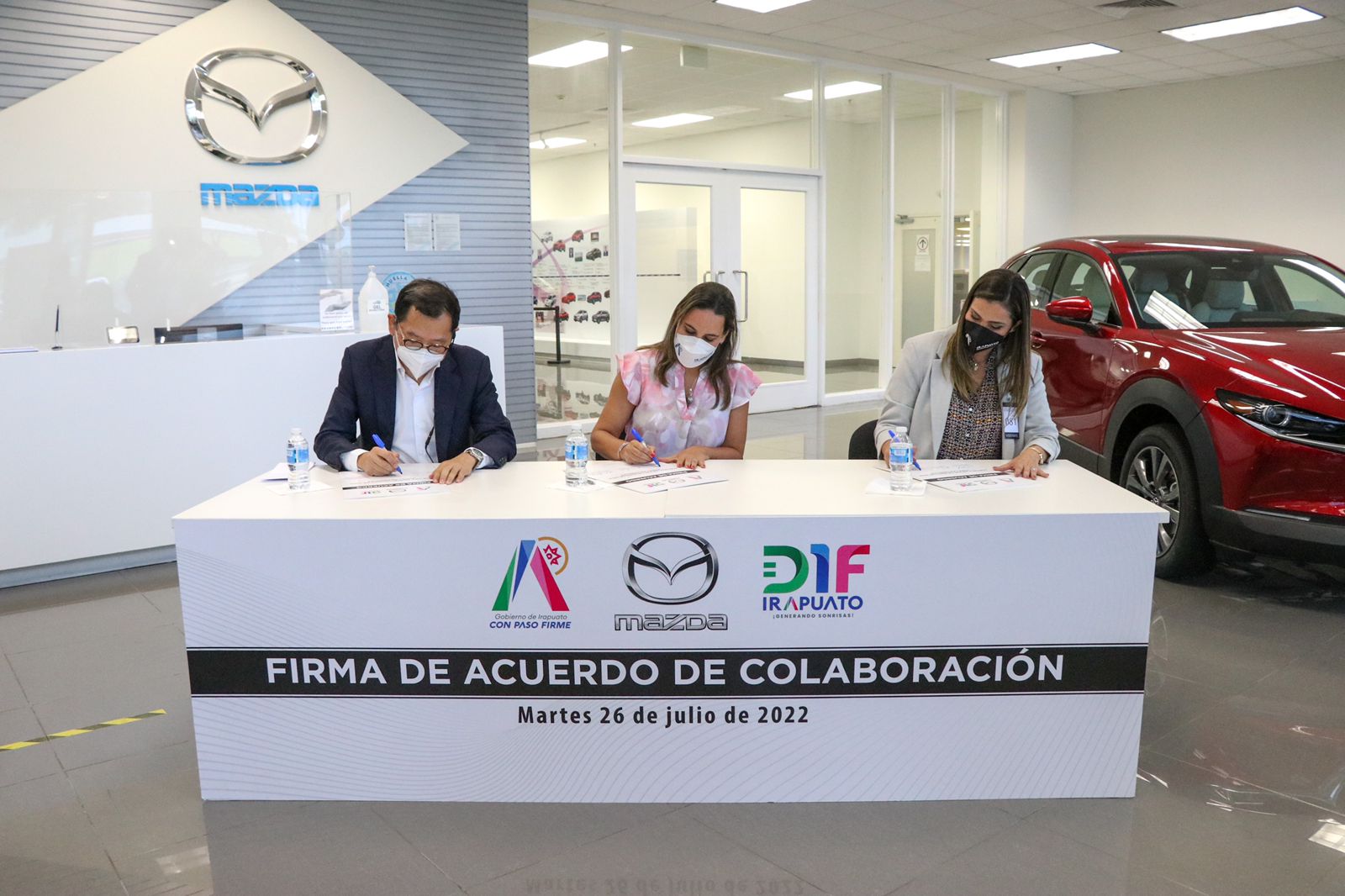 Salamanca, Gto. 26 de julio del 2022.- Mazda de México Vehicle Operation a través de la planta Mazda-Salamanca, se suma a la estrategia ‘Unidos Nadie Se Queda Atrás’ que impulsa el Gobierno de Irapuato a través del Sistema DIF Municipal, con una firma de convenio.