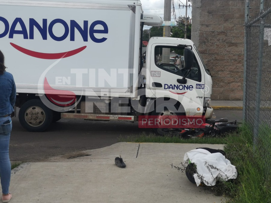 La unidad motora que conducía el masculino quedó debajo de la parte frontal de la camioneta con logos de la empresa Danone.