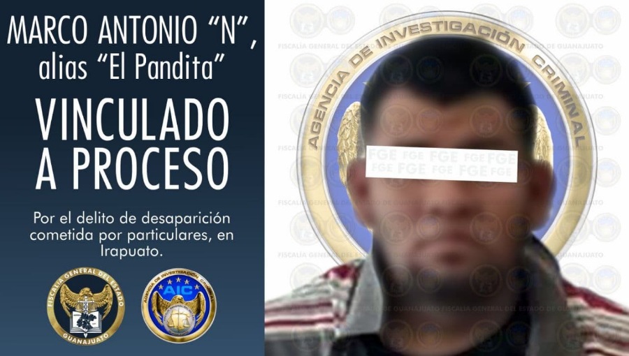 Irapuato, Gto. 27 de mayo de 2021.- En continuación de audiencia inicial y bajo cargos de desaparición cometida por particulares, la Fiscalía General del Estado obtuvo vinculación a proceso penal, en contra de Marco Antonio “N”, alias “El Pandita”. Este sujeto, en compañía de otros, con el uso de armas de fuego y violencia física, privaron de su libertad a dos víctimas a quienes mantuvieron en una casa de seguridad.