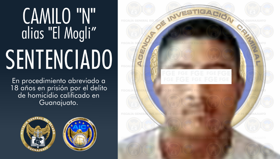 Guanajuato, Gto. 07 de diciembre de 2020.- La Fiscalía General del Estado, obtuvo de la autoridad jurisdiccional sentencia condenatoria de 18 años en prisión, dictada en procedimiento abreviado seguido en contra de Camilo “N” alias “El Mogli”, culpable del delito de homicidio calificado en agravio de una mujer en la comunidad El Tejaban.