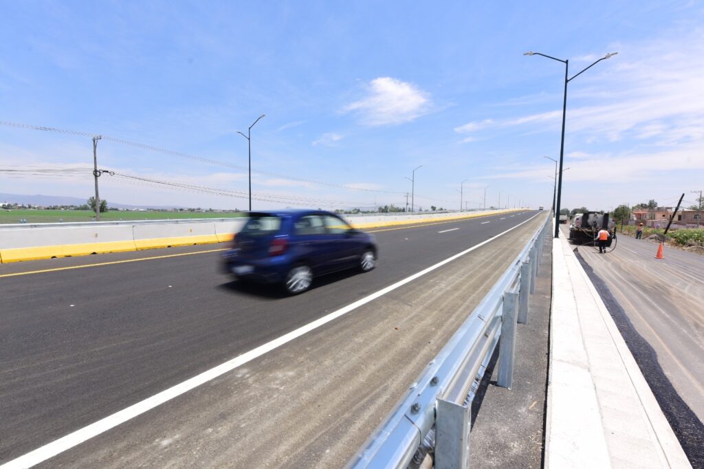 “Se terminó recientemente, como ustedes saben es un puente que tiene la particularidad, lo que es la carretera 90, los vehículos que circulan de largo itinerario, tendrán este paso elevado para pasar de manera segura por este entronque que enlaza diversas comunidades de la zona como La Soledad, Guadalupe de Rivera, Rivera de Guadalupe, Purísima de Covarrubias, todos estos enclaves, todo este entorno se ve beneficiado con ese puente”, detalló.