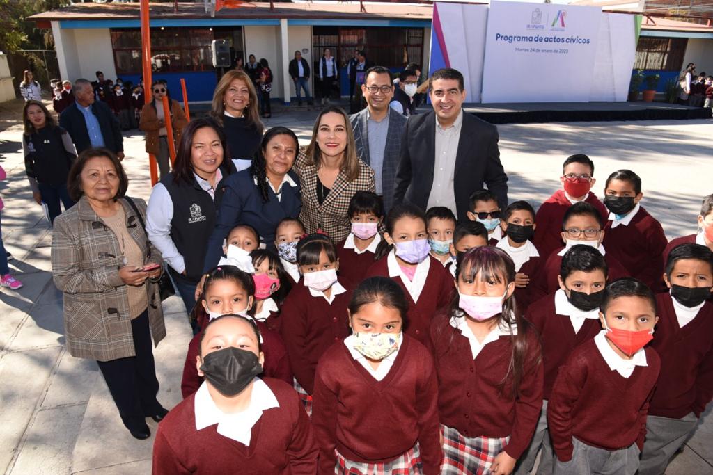 La directora del plantel, Rocía Patricia Gutiérrez Guerrero, agradeció todo el apoyo recibido por parte de la Administración que encabeza la presidenta Lorena Alfaro, pues ahora cuentan con mejores instalaciones, al construirse comedores, pintarse la fachada de la institución, así como los tableros de la cancha de basquetbol y salones, además de la elaboración de un mural que le da más color y vida a la escuela.