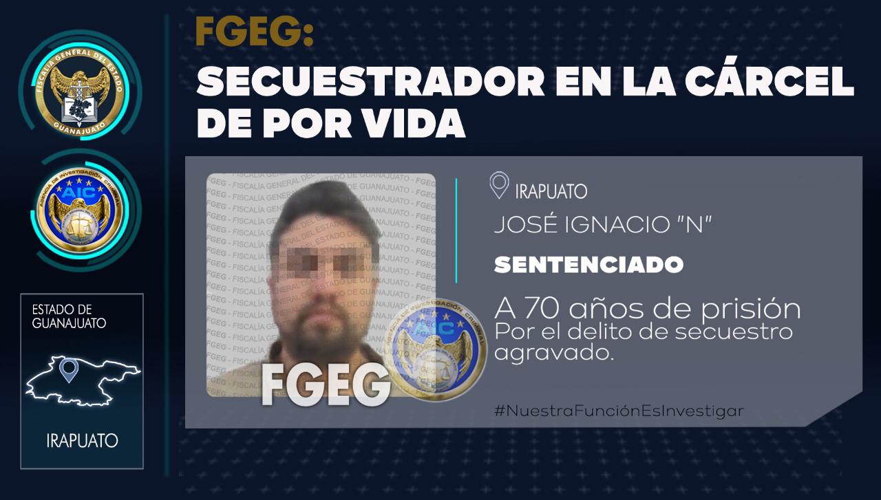Irapuato, Gto. 29 de marzo de 2022.- El secuestrador de un adolescente de 17 años y un adulto de 34 años, identificados como Kevin “N” y Juan “N”, ha sido sentenciado a 70 años de cárcel por el delito de secuestro agravado. La Fiscalía General del Estado a través del Agente del Ministerio Público en la Unidad Antisecuestros obtuvo que el sentenciado repare el daño moral y psicológico a las víctimas indirectas de su conducta delincuencial.