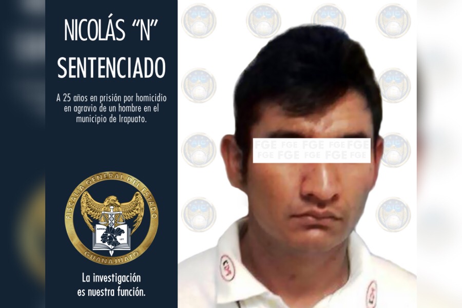 Irapuato, Gto. 25 de julio de 2019.- Nicolás “N” ha sido condenado a pasar 25 años en prisión, tras la imputación formulada por agentes de la Fiscalía General del Estado (FGE), por el delito de homicidio doloso, en agravio de un hombre a quien privó de la vida con arma de fuego en la comunidad Ejido de Malvas, del municipio de Irapuato.