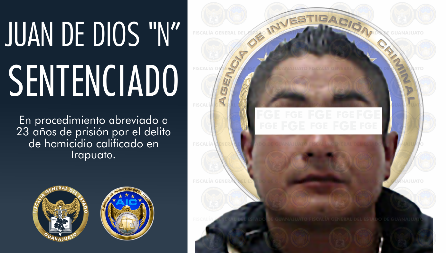 Irapuato, Gto. 21 de diciembre de 2020.- En procedimiento abreviado la Fiscalía General del Estado (FGE) obtuvo sentencia condenatoria de 23 años de prisión para Juan de Dios “N”, culpable del delito de homicidio calificado en agravio de quien en vida respondía al nombre de Juan «N», en hechos ocurridos el 14 de octubre de 2018 en un establecimiento en Irapuato; además se le impuso una multa y el pago por concepto de la reparación del daño en favor de los deudos de la víctima.