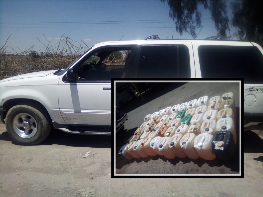 Del camino terracero a Villas de San Cayetano, se checa una camioneta Explorer modelo 96 de color blanca con placas Americanas, donde se aseguran 42 garrafas de 20 litros, 8 de 25 litros, todas ellas llenas en su totalidad.