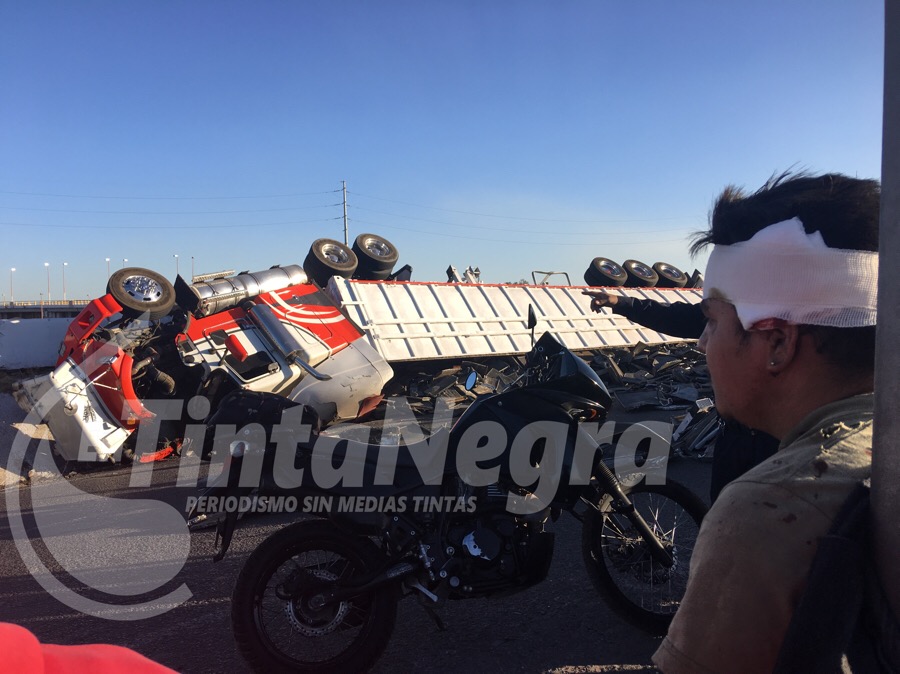 Carlos Eduardo Hernández Salmerón, chofer del trailer Kenwhort fue atendido en el lugar por paramédicos de Protección Civil. Dijo que perdió el control del volante y el peso de la carga produjo la volcadura.